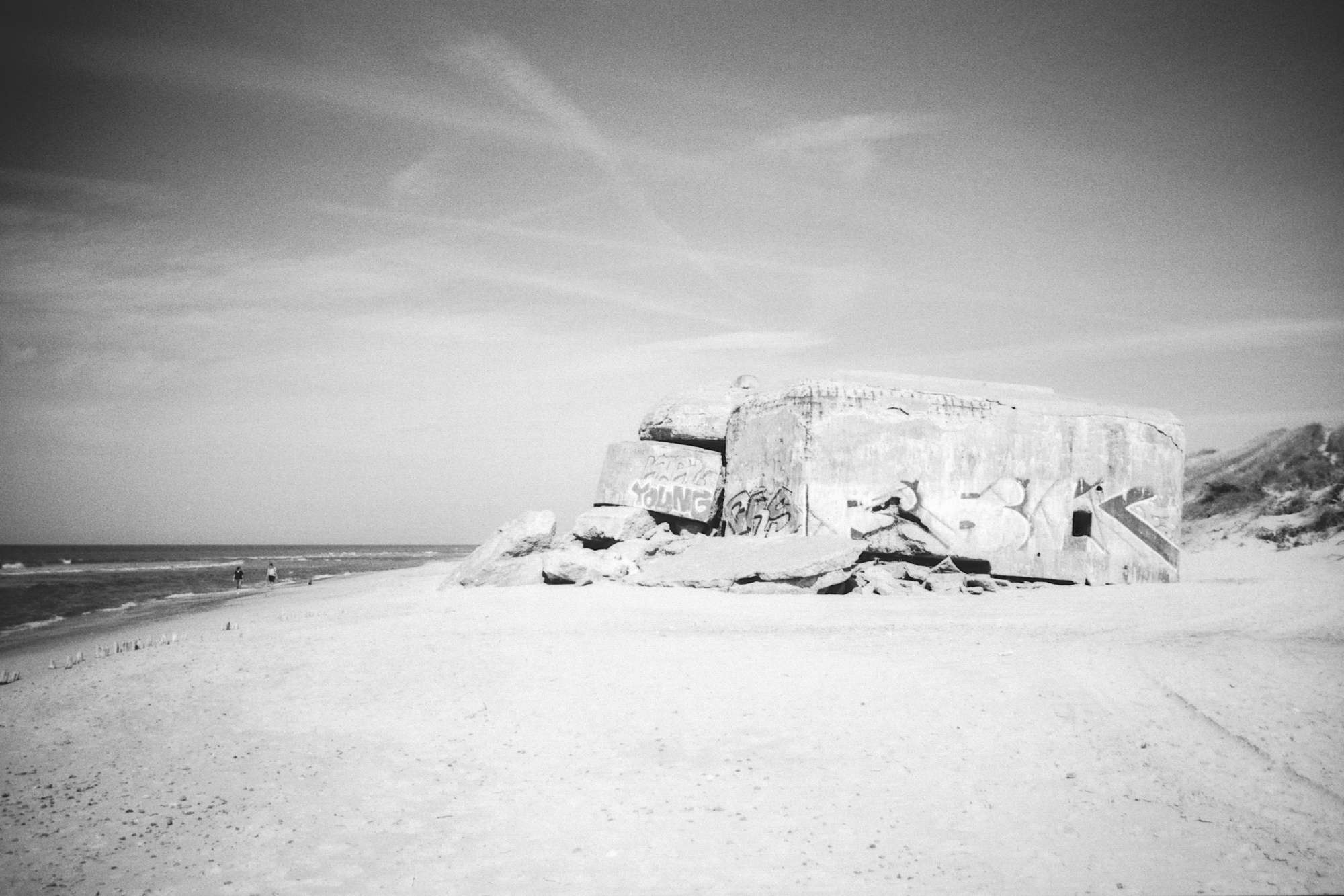 Natürlich bieten sowohl der Strand als auch die Dünen viele schöne Fotomotive. Sehr glücklich war ich auch über ein Foto der Wendeltreppe des Leuchtturms Lyngvig. Ich liebe Treppen! Ein wenig befremdlich wirkt aber etwas anderes: Bunker. Es gibt zwar durchaus bunkerfreie Abschnitte, doch hin und wieder stößt man auf sie. Oftmals nicht nur auf einen einzelnen Bunker, sondern ganze Gruppen. Und dann fällt einem wieder ein, dass dieser schöne Strand mal Teil des Atlantikwalls war. Teilweise wirken die teils halb im Sand versunkenen Bunker so, als hätte ein Riese mit Betonklötzen gespielt und sie einfach liegen gelassen. Einige haben sich jedoch eine gewisse Bedrohlichkeit erhalten. Es prallen Welten aufeinander, wenn man an einem wunderschönen Strand plötzlich vor der Schießscharte einer MG-Stellung steht. Auf mich wirkte das etwas surreal, auch wenn ich Lost Places sehr mag.